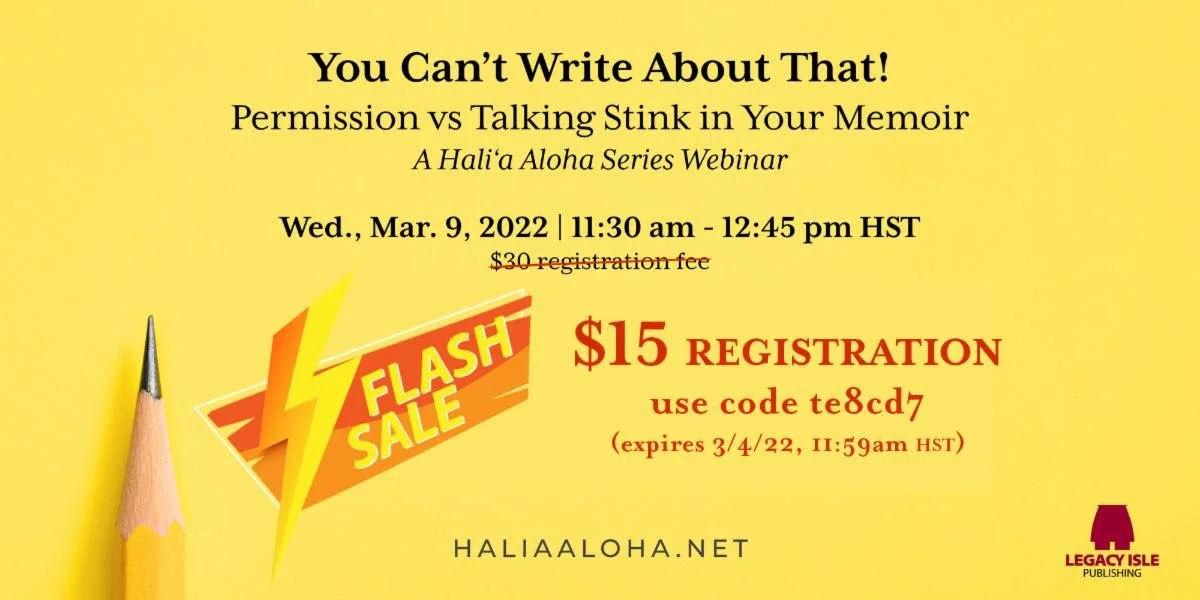 What's holding you back from writing your memoir? Is it the fear of reaction to what you've written? Join Legacy Isle Publishing for "You Can't Write About That!" a webinar from The Hali‘a Aloha Series on what you can/cannot write about in your memoir, the line between public and private, and asking permission. Register now: https://www.crowdcast.io/e/rdh1amls/register